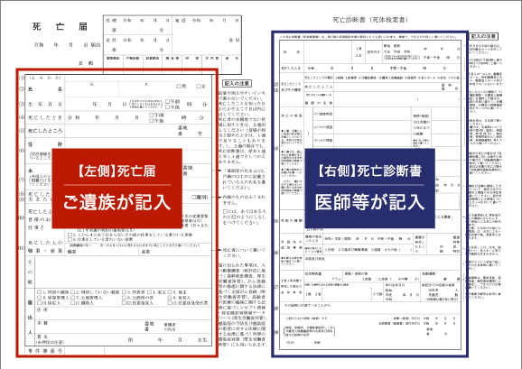 医師が記入した死亡診断書に対し、ご遺族の方が死亡届部分を記入して提出します。